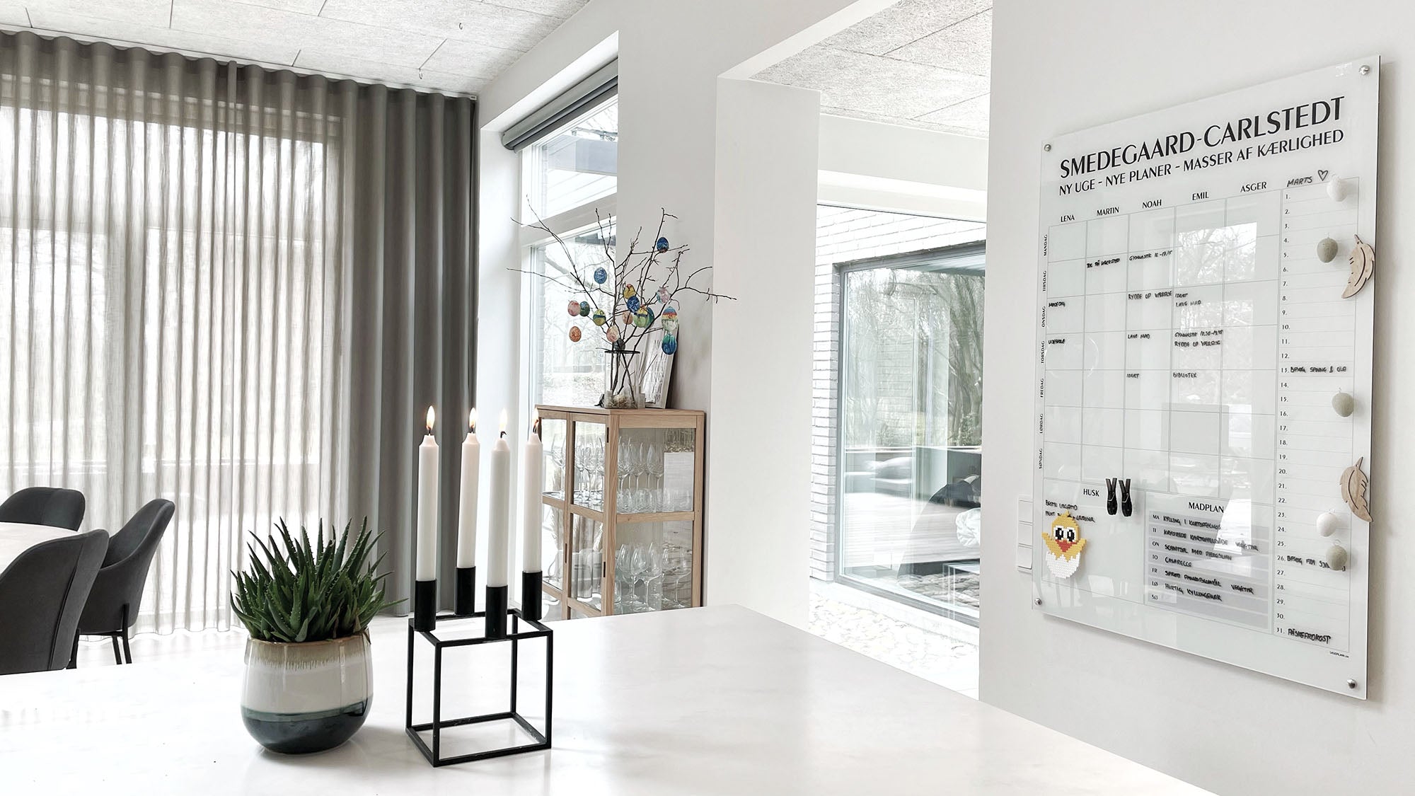 Du skriver på kalenderen med whiteboard tusch, som nemt viskes ud.